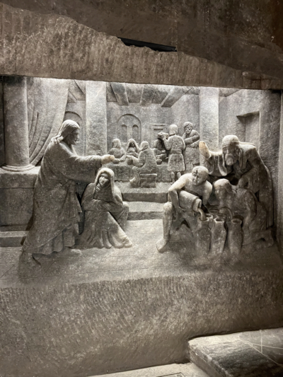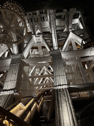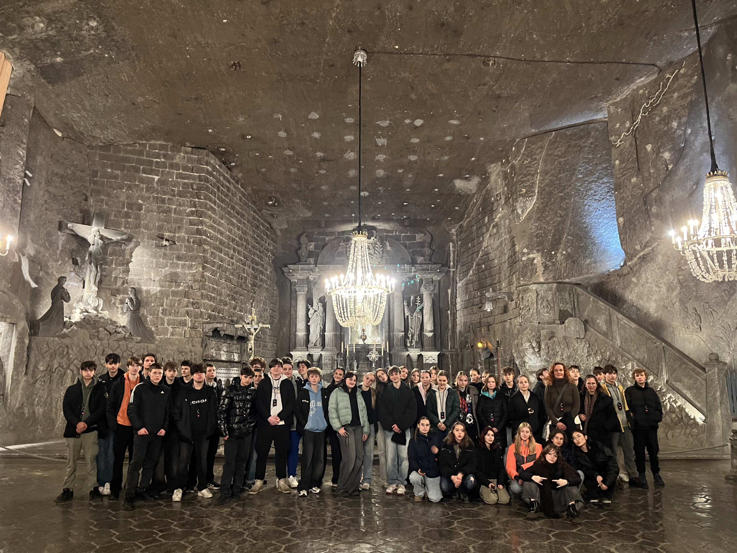 Druhý den, 10. prosince, přinesl kulturní a architektonický kontrast. Po přenocování jsme se vydali za unikátním zážitkem do světoznámého Solného dolu Wieliczka (UNESCO). Sestoupili jsme téměř 130 metrů pod povrch, kde žáky uchvátila nejen obrovská velikost podzemních síní, ale především umělecká díla vytesaná ze soli. Největší dojem zanechala velkolepá Kaple sv. Kingy se solnými oltáři a lustry. Na povrch nás vyvezl originální hornický výtah.
