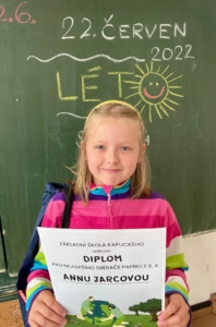 Jak jistě víte, naše škola se zapojuje do sběru papíru a vedeme si poměrně dobře. Letos se nám povedlo z tříděného odpadu ve škole a z papíru přineseného žáky odvézt k recyklaci téměř 8 tun papíru. Moc si vážíme snahy všech žáků i rodičů, kteří se do sběru zapojili, protože díky tomu se naše škola umístila na krásném 2. místě v „Soutěži s panem Popelou“ od společnosti FCC. Do školy tak putují věcné ceny v hodnotě 5 000 Kč.