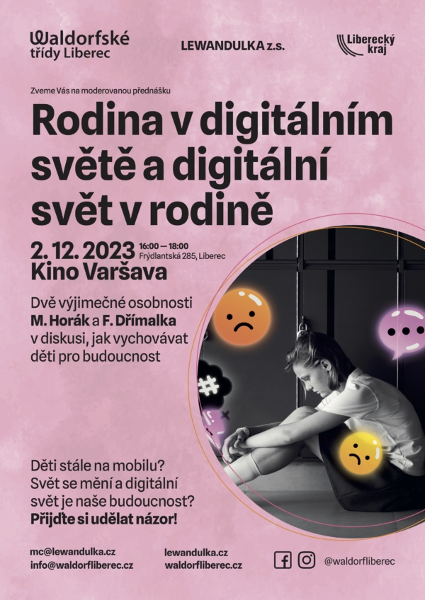 Srdečně Vás zveme na moderovanou přednášku Rodina v digitálním světě a digitální svět v rodině s Milanem Horákem, zkušeným učitelem společenských věd a informatiky na waldorfském lyceu v Praze a s Filipem Dřímalkou, zakladatelem Digitask.cz, Digiskills.cz, Digichallenge.cz, autorem knihy HOT: Jak uspět v digitálním světě o médiích kolem nás a jak v mediálním světě vychovávat děti tak, aby z nich rostly plnohodnotné bytosti, ukotvené v reálném světě.